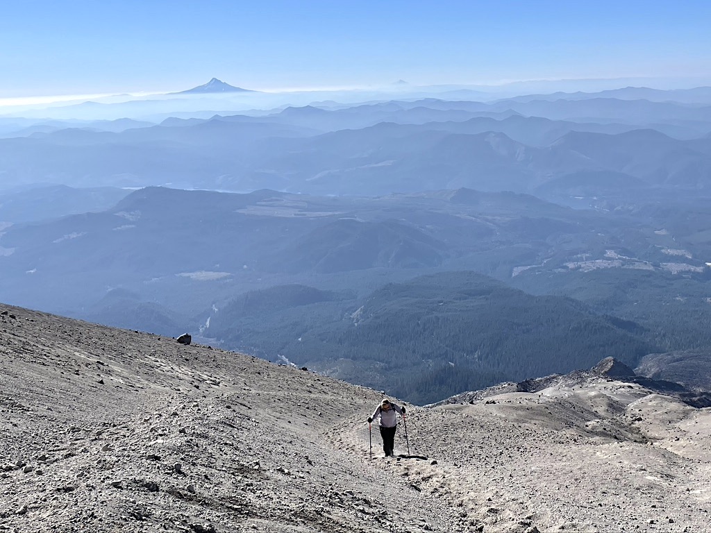 On our final day in the Washington Cascades, in the pre-dawn darkness, we returned to Mount St. Helens to attempt to climb to the rim of the active crater. Scaling Mount St. Helens included a mile-long arduous scramble over minivan-sized boulders and a final mile-long unrelenting slog up a steep incline of volcanic ash.