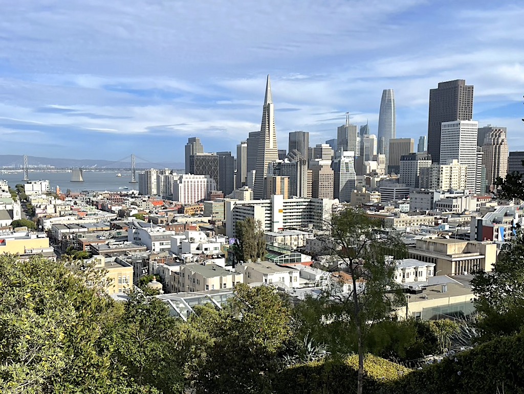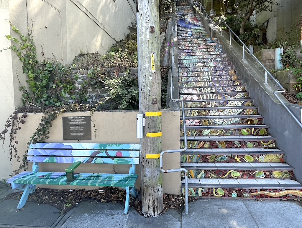 Walking San Francisco’s hilly streets has been part of our daily routine. Not to belittle the seven hills of Rome, but San Francisco was built on 48 of them. Instead of taking the little cable cars halfway to the stars, we have reached the hilltops using the city’s countless steps and discreet stairways.