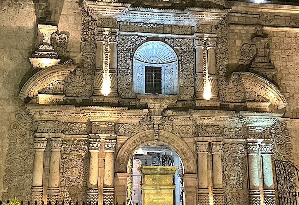 During the colonial period, the wealthy and powerful Catholic Church also constructed other ornamental religious buildings in Arequipa. The oldest is the Church of the Compañia, whereupon the Andean baroque style originated. Characteristic of this regional decorative design, its carved sillar façade and interior artwork depict South American motifs, including birds, plants and native human figures.