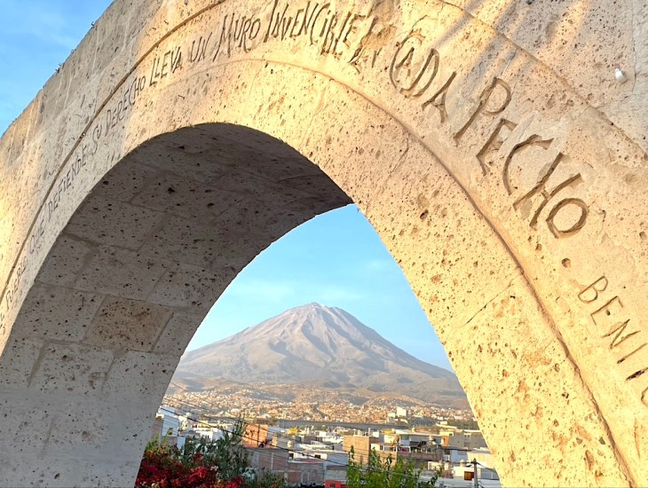 Feature Photo: White sillar stone arches and Misti Volcano, from the Yanahuara Mirador, Arequipa