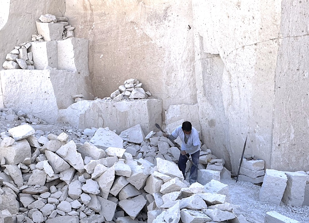 Besides being easy to carve, sillar stone is lightweight, strong enough to withstand stresses, and has a porosity that acts as a thermal insulator. Geologically, sillar is an ignimbrite, formed when hot volcanic ash flows or falls from an andesitic volcanic eruption. Just outside Arequipa, we went to the rock quarry where the sillar stone is excavated.