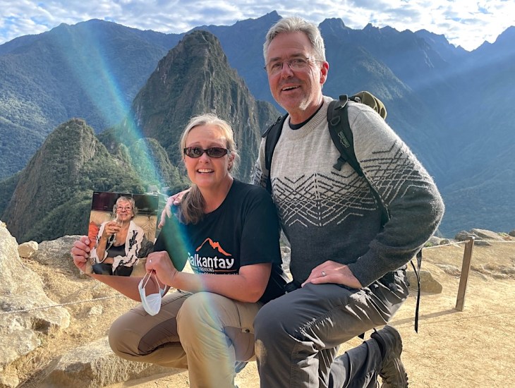 Feature Photo:  Sadly, this past February, Esther’s mother Leny passed away. During her last days, she confided that one of her regrets in life was never to have seen Machu Picchu. To celebrate her life and help her posthumously realize her dream, Esther carried a photograph of her mother on our Salkantay trek to Machu Picchu. There, on the winter solstice, we spent a few minutes with her overlooking the sacred site. Given the beam of light captured in our photo, it appears that the sun god Inti has given his blessing.