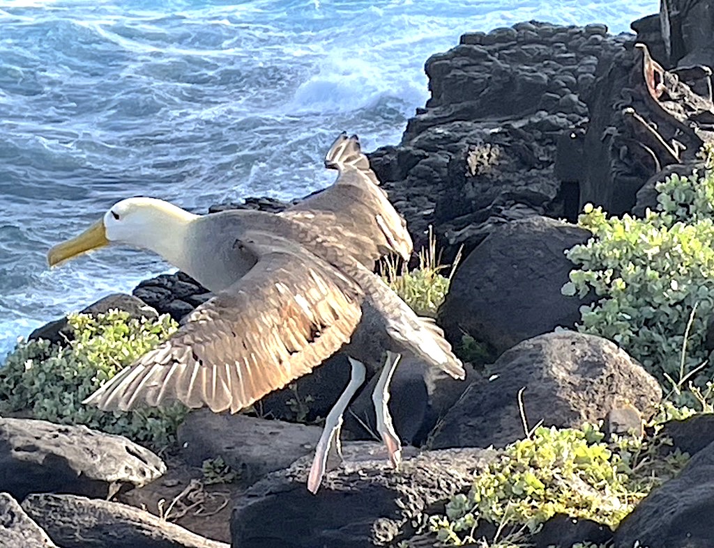 Because the waved albatross spends most of its life foraging over the open ocean, and only heads to these cliffs to mate, they are elegant in the sky but awkward on dry land. We admired their grace as they soared overhead, but had to chuckle at their tentative and ungainly take-offs and clumsy crash landings.