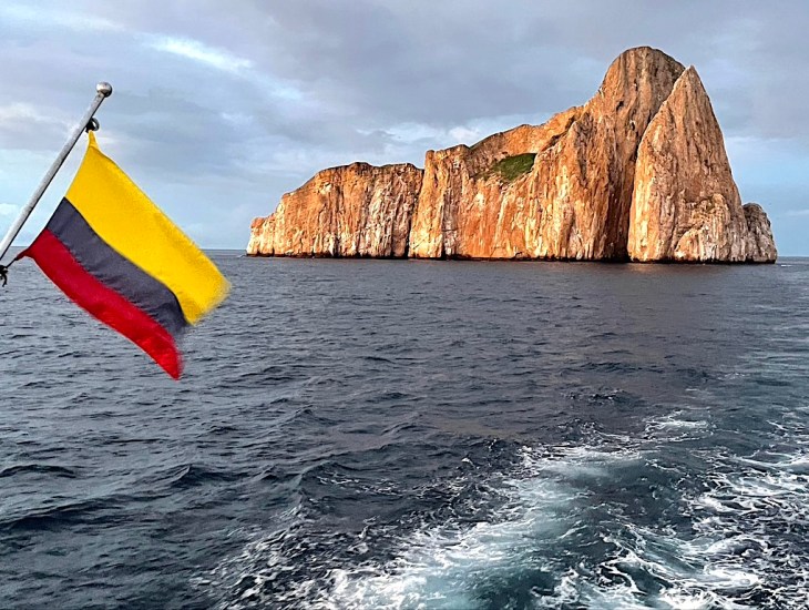 Feature photo: Kicker Rock at sunset from the fantail of the Archipel 1, with the flag of Ecuador flapping in the wind